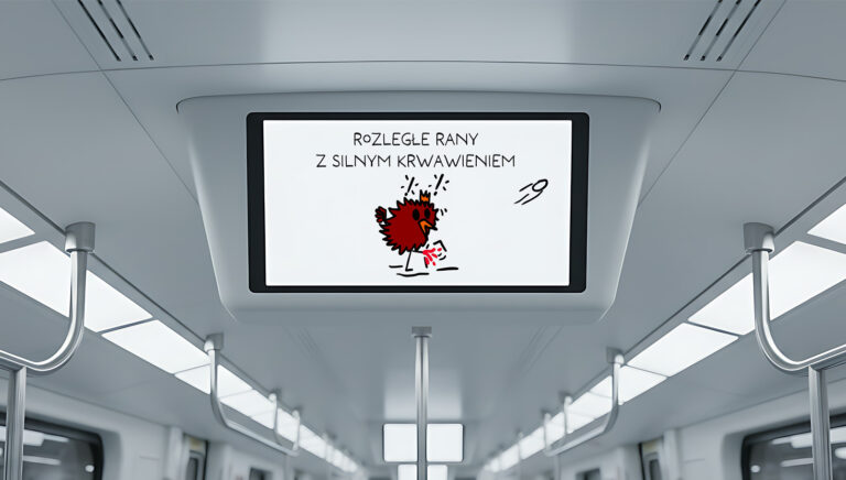 Materiał wyróżnia się na tle standardowych komunikatów bezpieczeństwa dzięki charakterystycznej oprawie graficznej, co zwiększa szanse zapamiętania przekazu przez odbiorców.